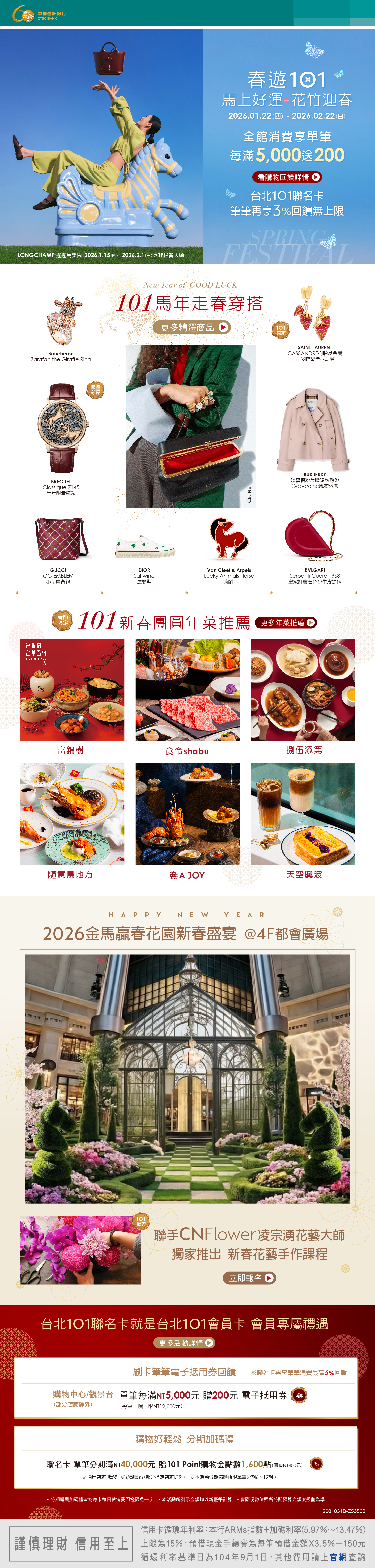 【台北101聯名卡獨享】春遊101,馬上好運.花竹迎春,全館消費享單筆每滿5000送200,聯名卡再享3%回饋無上限!