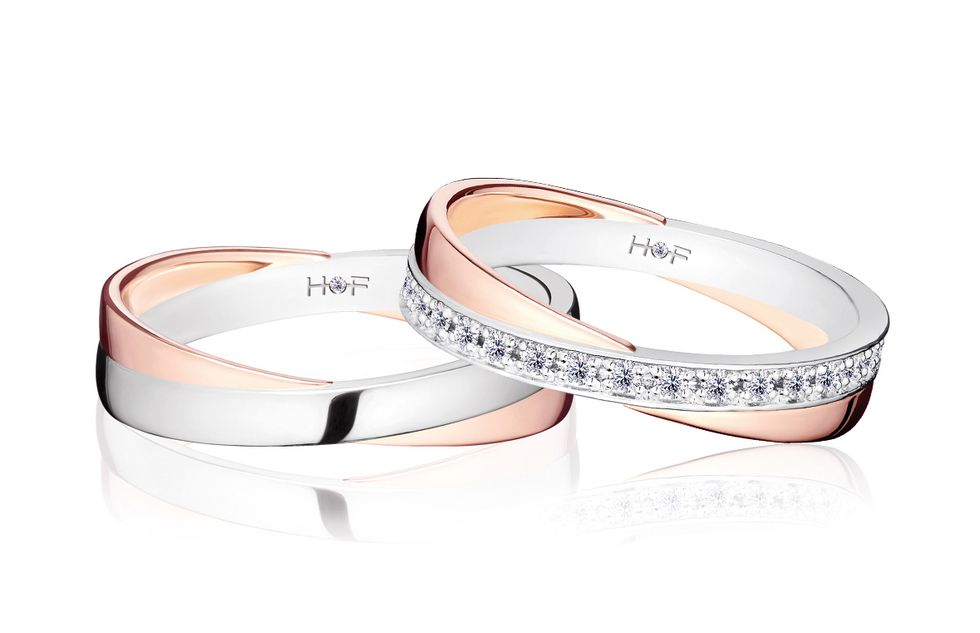 (Left) Embrace wedding ring pair, PT950 platinum and 18K rose gold, diamond 0.01 carat, starting from about NT39,000, Hearts on Fire.