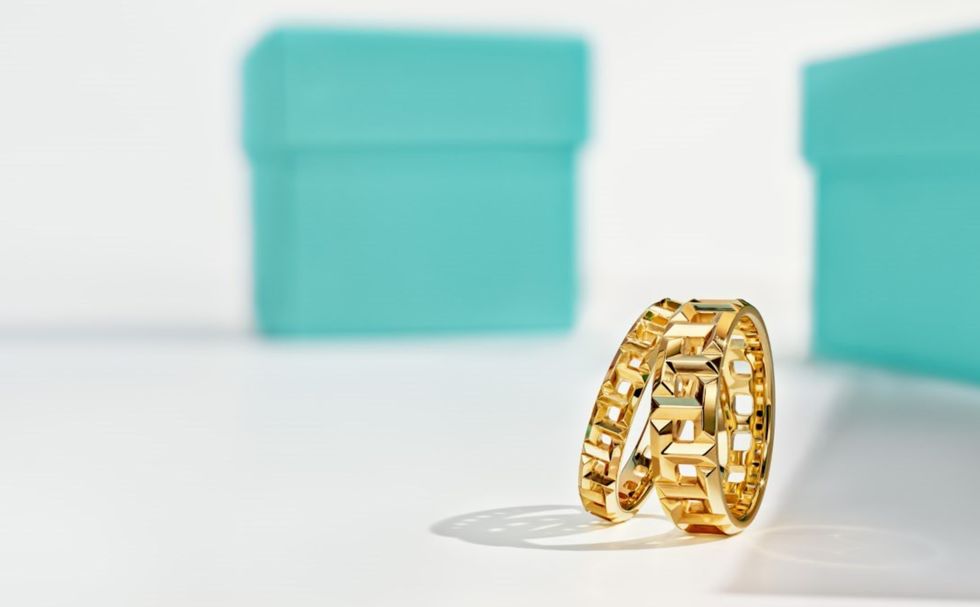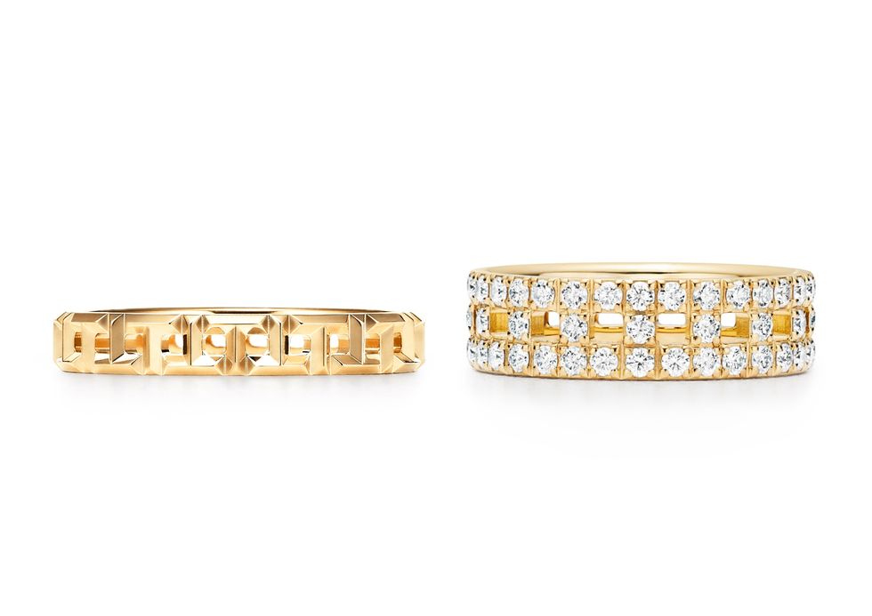 (Left) T True 18K gold narrow version hollow T design ring, about NT35,000, Tiffany & Co.