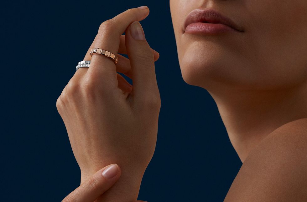 (Right) Ice Cube Pure mini series ring_set with a single diamond, Fairmined certified 18K rose gold, about NT32,000, Chopard.