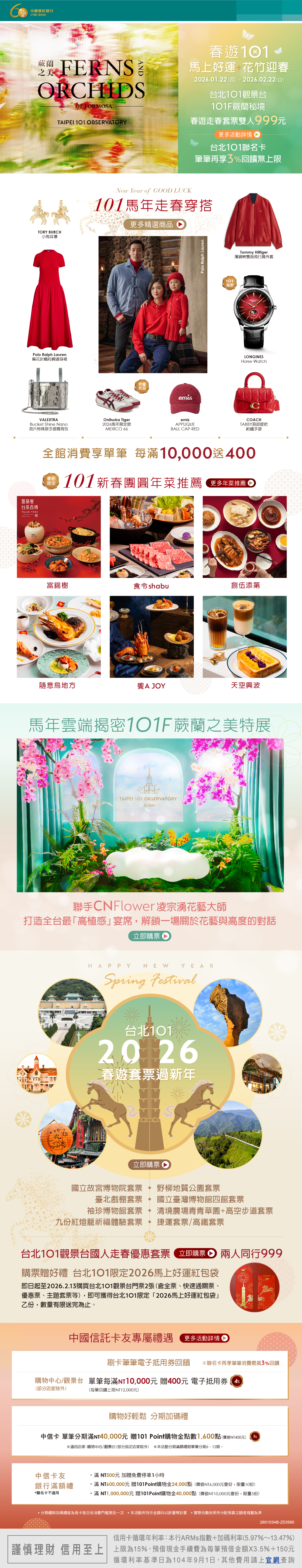【中信卡友專屬】春遊101,馬上好運.花竹迎春,全館消費享單筆每滿1萬送400,聯名卡再享3%回饋無上限!