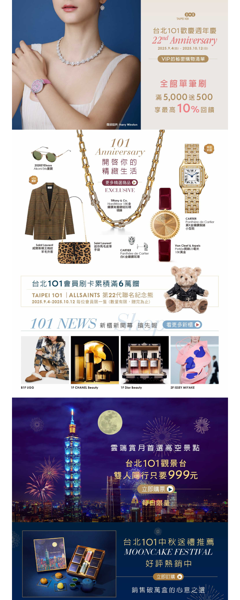 【台新卡友專屬活動】歡慶台北101週年慶,台新卡友最高回饋享10%起! 刷卡好康 🎉【台北101週年慶來了!9/4–10/12 一起迎接最精緻的秋日假期】🎉從101件獨家新品、頂級品牌超值回饋,到聯名卡獨享的尊榮體驗,今年週年慶絕對是購物控的天堂!【歡慶台北101周年慶】線上型錄搶先看💎 精品滿萬享10%回饋、珠寶腕錶也有6%超值回饋🎁 尊寵會員累積滿百萬送40,000點101 Point 購物金!刷台新Richart卡,切換「大筆刷」方案,享最高3.3%回饋,單筆滿5,000元,指定期間完成領券及台新帳戶自動扣款台新信用卡帳單,再享7%回饋,活動詳情>> 返回上頁