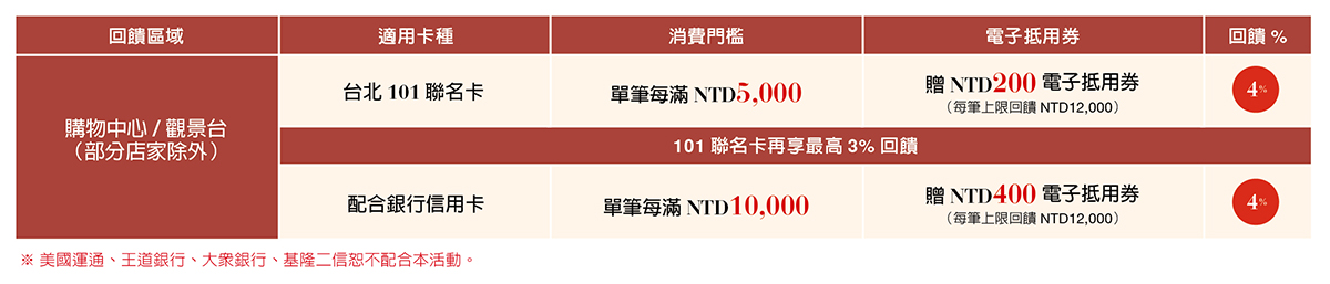 活動期間(1/22-2/22),凡刷台北 101 聯名卡單筆每滿 NTD 5,000 送 200,最高可享 8% 回饋。