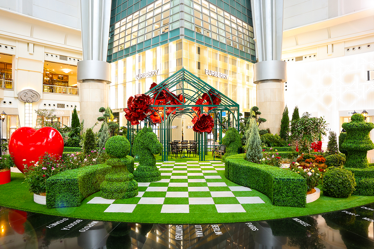 今年春節,台北 101 四樓都會廣場化身為大型藝術花藝作品「皇后花園」。由 CN FLOWER 主理人凌宗湧大師操刀,運用超過十種珍稀玫瑰品種,如「星空紫」、「夢幻仙境」與「熱戀情節」等,交織出細膩的春日香氣。現場更結合紅心、骰子與騎士造景,讓您彷彿置身《愛麗絲夢遊仙境》般的童話世界,是新年走春必拍的絕美景點。