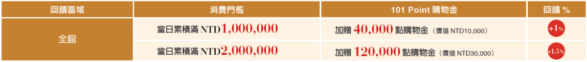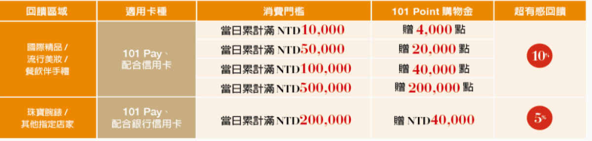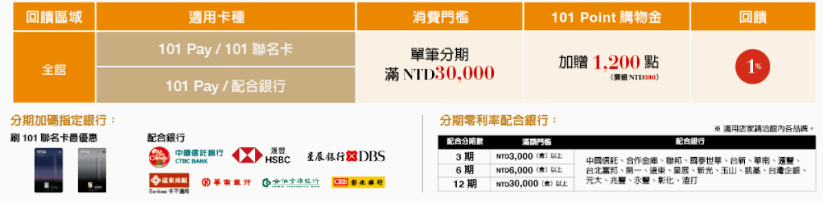 Please refer to the on-site announcement for the above detailed activity methods. Taipei 101 Shopping Center and various banks reserve the right to change or terminate this event without prior notice.
