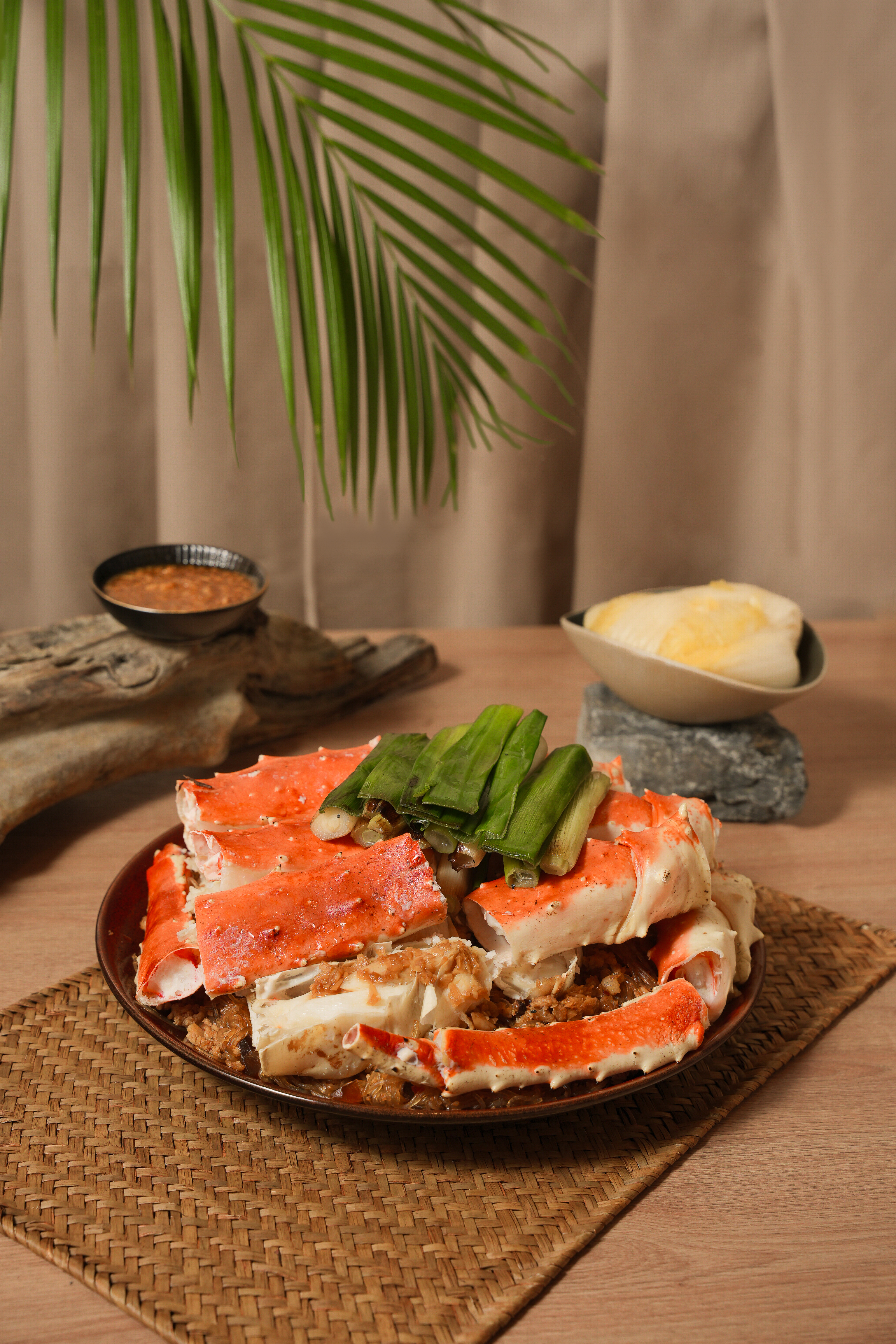 清蒸蒜香鱈場蟹 精選日本鱈場蟹,蟹肉鮮美厚實,蒸煮後與自製蒜香醬完美融合,再搭配皮蛋、豆豉拌炒冬粉,鹹香濃郁、香氣撲鼻,是一道揉合粵式粉絲蟹與台式熱炒精神的奢華鉅獻。